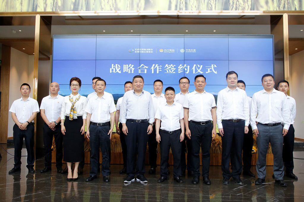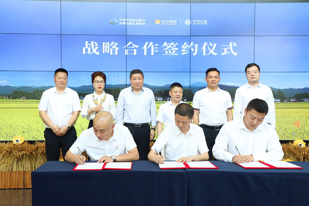 2019年5月18日,天府優(yōu)質(zhì)糧油融合發(fā)展功能區(qū)管委會(huì)、蘇寧易購(gòu)、華地永盛戰(zhàn)略合作簽約儀式在華川集團(tuán)天府良倉(cāng)農(nóng)業(yè)總部隆重舉行。中共崇州市常委、總工會(huì)主席王成龍、天府優(yōu)質(zhì)糧油融合發(fā)展功能區(qū)管委會(huì)黨工委副書(shū)記廖慶、蘇寧易購(gòu)集團(tuán)西南地區(qū)執(zhí)行副總裁兼成都地區(qū)管理中心總經(jīng)理?xiàng)钊f(wàn)波、四川蘇寧易購(gòu)超市公司副總經(jīng)理尹小璐等代表出席本次活動(dòng)。華川集團(tuán)黨委委員、副總裁楊開(kāi)榮、華地永盛農(nóng)業(yè)發(fā)展有限公司總經(jīng)理鄭舒姍對(duì)出席本次活動(dòng)的代表嘉賓表示熱烈歡迎。