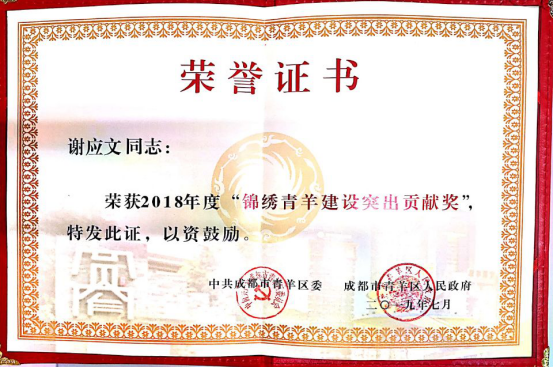 2019年7月,經(jīng)中共成都市青羊區(qū)委辦公室、成都市青羊區(qū)人民政府辦公室評(píng)選,集團(tuán)董事長(zhǎng)、總裁謝應(yīng)文榮獲2018年度“錦繡青羊建設(shè)突出貢獻(xiàn)獎(jiǎng)”先進(jìn)個(gè)人稱(chēng)號(hào)。
