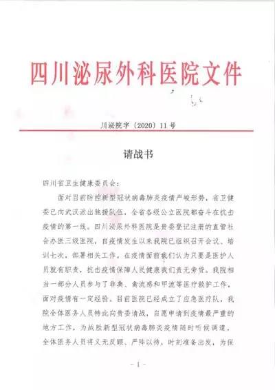 1月28日集團旗下四川省泌尿外科醫(yī)院黨政工群各級領導干部、防控應急醫(yī)療隊和醫(yī)院技術骨干100余人召開請戰(zhàn)大會,主動向省衛(wèi)健委請戰(zhàn)馳援武漢,請戰(zhàn)書已于當日送達,省衛(wèi)健委對醫(yī)護人員積極抗擊疫情給予肯定贊揚,并指示爭取第三批次派遣醫(yī)護人員前往疫區(qū)第一線。1月31日起,該院根據(jù)省中醫(yī)管理局公布的冬春季呼吸道傳染病預防建議處方,緊急熬制中藥湯劑,免費向市民發(fā)放,每天限量供應1000人份(6000袋)。