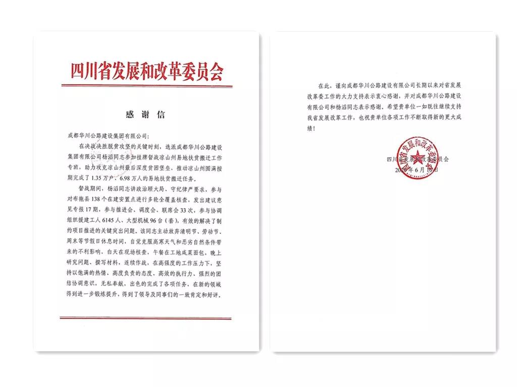 助力涼山州易地扶貧搬遷 再現(xiàn)華川人嚴(yán)格律己品質(zhì)——華川集團(tuán)獲致四川省發(fā)展和改革委員會(huì)感謝信