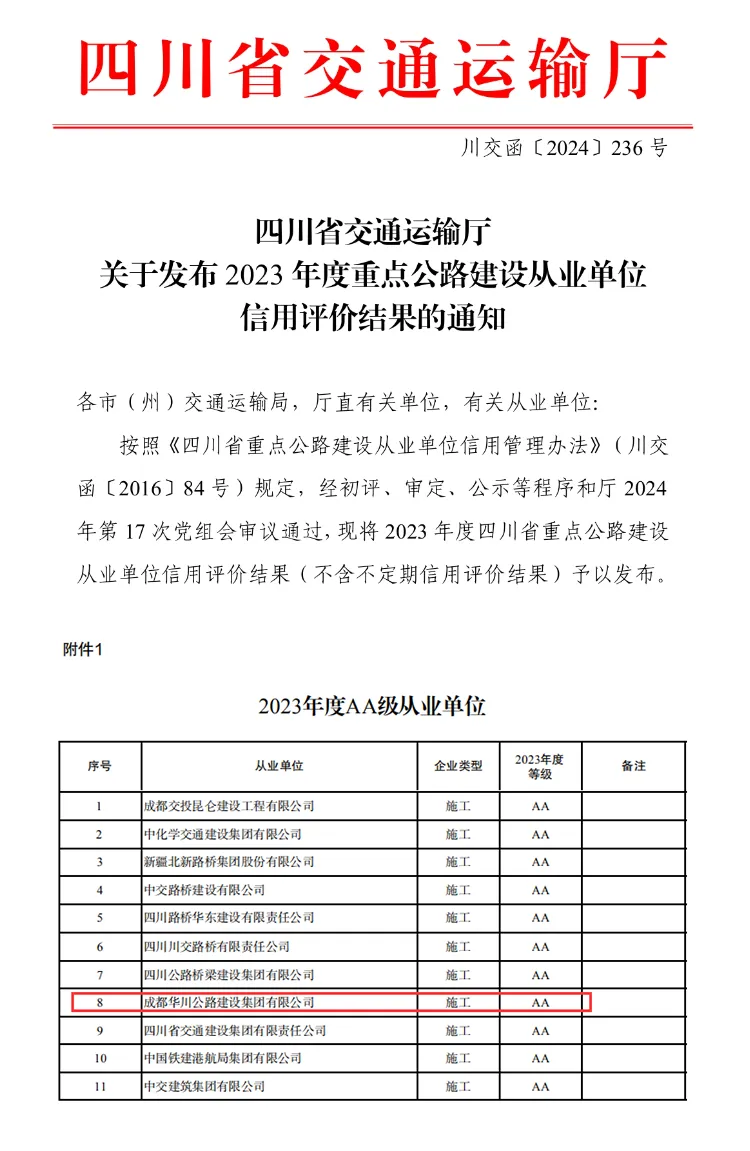 集團(tuán)榮獲四川省重點(diǎn)公路建設(shè)從業(yè)單位2023年度信用評(píng)價(jià)“AA”等級(jí)