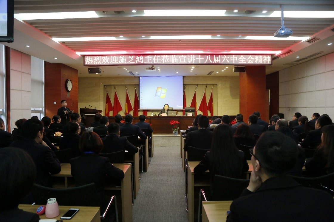 參觀(guān)結(jié)束后,施副主任來(lái)到集團(tuán)總部一樓會(huì)議廳,用近三個(gè)半小時(shí)時(shí)間,為集團(tuán)全體員工專(zhuān)題宣講黨的十八屆六中全會(huì)精神。他著眼十八屆六中全會(huì)概況、重大歷史貢獻(xiàn)、全會(huì)背景和準(zhǔn)則條例的起草過(guò)程,圍繞三大原則和五大規(guī)律性認(rèn)識(shí)、兩條思想紅線(xiàn)、四個(gè)方面的頂層設(shè)計(jì)等內(nèi)容,抽絲剝繭,娓娓道來(lái),系統(tǒng)全面地對(duì)全會(huì)精神進(jìn)行了深入講解。特別是他通過(guò)自己參與中央文件起草工作的切身體會(huì)和所感所悟,深入講解了黨的十八大以來(lái),習(xí)近平總書(shū)記在“四個(gè)全面”、“五大建設(shè)”總體布局中所體現(xiàn)出的治國(guó)理政的大智大勇、鐵肩擔(dān)當(dāng)?shù)念I(lǐng)袖情懷,為集團(tuán)員工更好地理解貫徹全會(huì)精神、準(zhǔn)確把握準(zhǔn)則條例的精神實(shí)質(zhì),提供了有力的幫助和指導(dǎo)。
