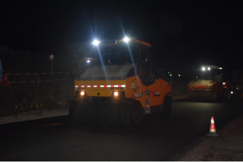在各施工現(xiàn)場,不懼嚴寒、熱火朝天。攤鋪機、壓路機、運料車等各類施工機械一派繁忙,全體人員履職盡責、分工協(xié)作,各項施工作業(yè)有序進行著。項目領(lǐng)導班子工作重心前移生產(chǎn)一線,實行現(xiàn)場辦公,第一時間解決施工重難點,日夜巡查督導質(zhì)量安全、施工進度、材料保供等工作內(nèi)容,確保項目生產(chǎn)高效推進;工程人員加強前后場的相互配合、按需供料,保證施工不間斷;5+2、“白+黑”、雨加晴,24小時堅守崗位、奮戰(zhàn)一線,嚴格按照施工技術(shù)及標準規(guī)范高標準、嚴要求開展每天的施工任務;時刻緊盯每一個施工環(huán)節(jié),嚴格控制施工質(zhì)量,一一落實混合料配合比、溫度、厚度、寬度、攤鋪、碾壓等質(zhì)量控制要點,確保攤鋪、碾壓等工序的有序銜接;同時強化安全規(guī)范操作,嚴防各類安全事故發(fā)生。